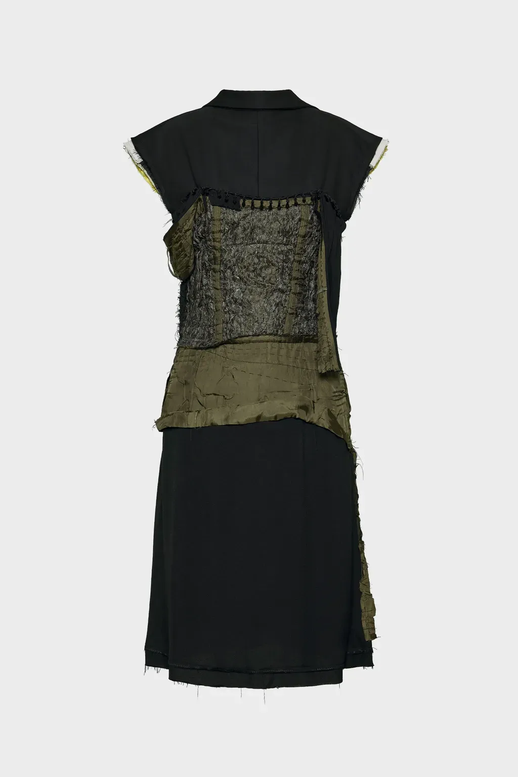 DescriptionA demonstration of the maison’s décortiqué technique, the dress appears reformed in multiple contrast layers. It is cut just below the knee, with loose threads and distressed elements to indicate a garment that is never finished. It features capped sleeves and a crew-neck, with peak lapels on the reverse to create a low-back shape.