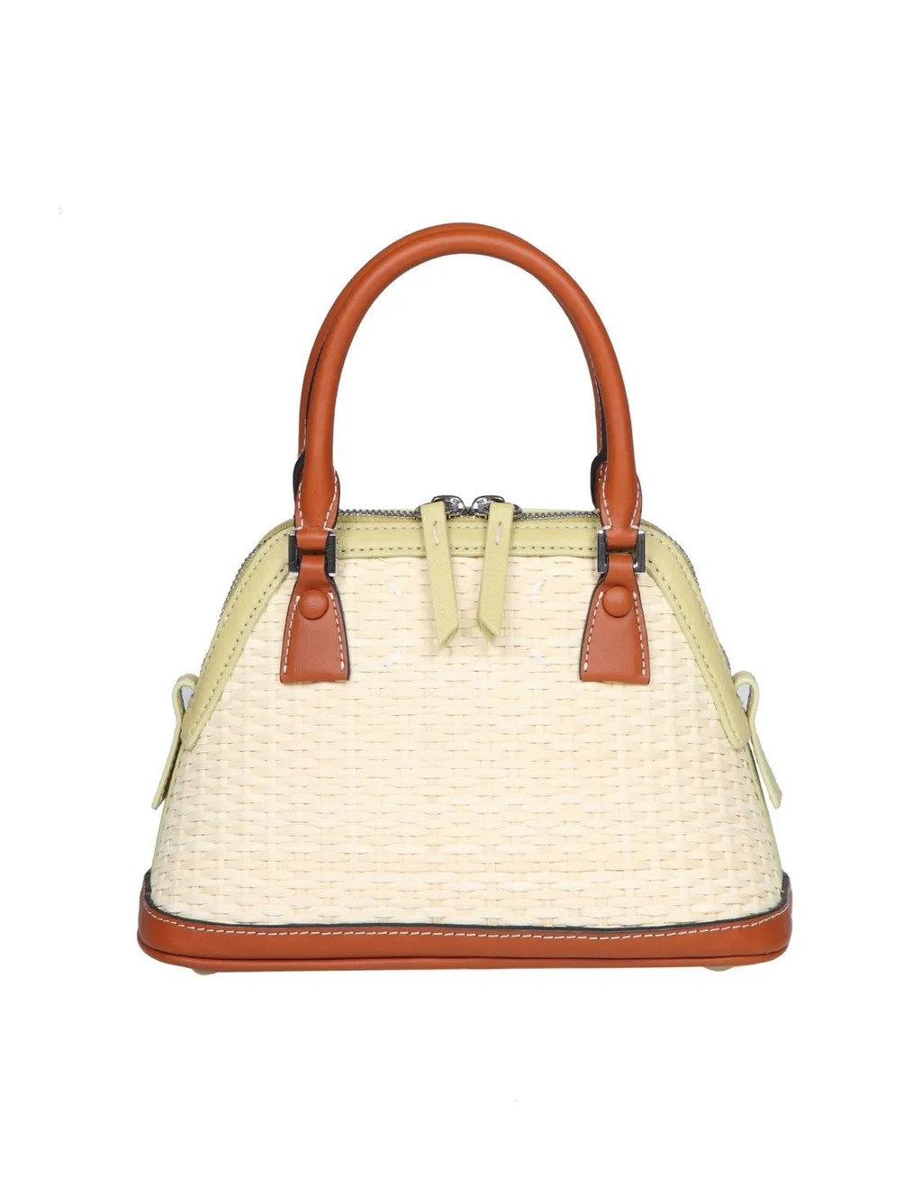 A dome-shaped handbag with a woven straw body and smooth leather trim. It features dual top handles and a detachable chain and leather shoulder strap. The bag has a zip-top closure.
