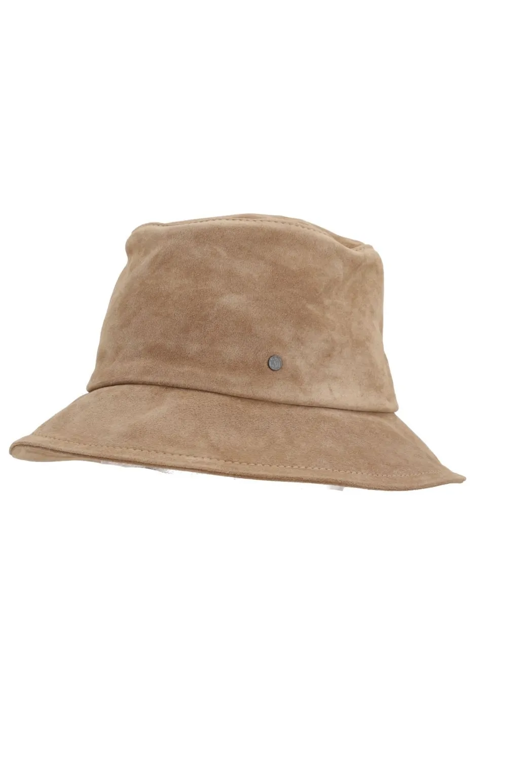 A simple bucket hat with a round crown and a medium brim. It features a small metal accent on the side.