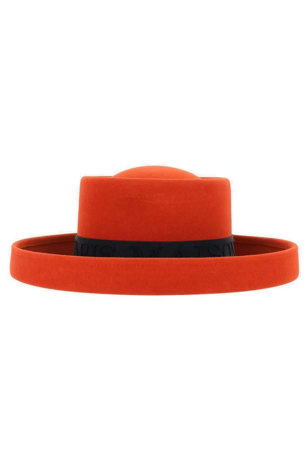 A bright orange felt hat with a flat brim and a black band around the crown. The hat has a cylindrical crown with a rounded top and a wide, flat brim.