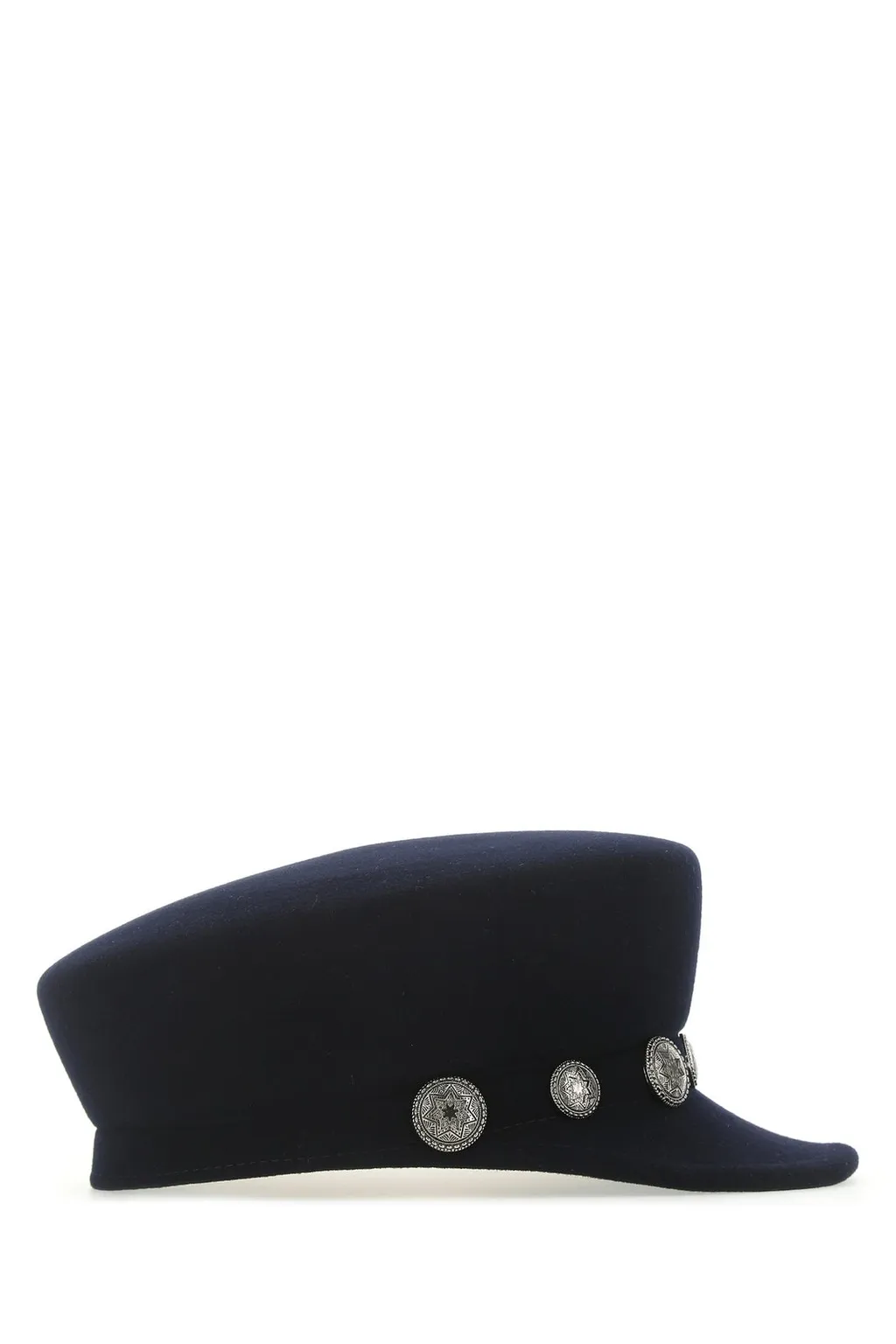A black hat with a flat top and a band adorned with decorative silver-toned circular embellishments.