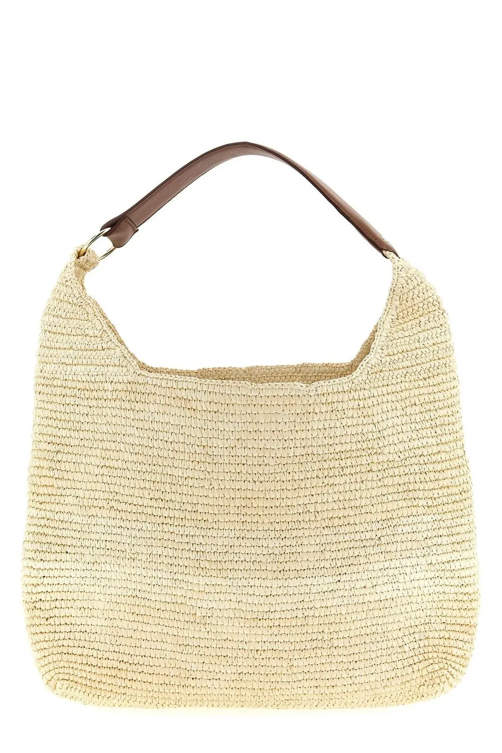 A woven straw hobo bag with a single brown leather strap.