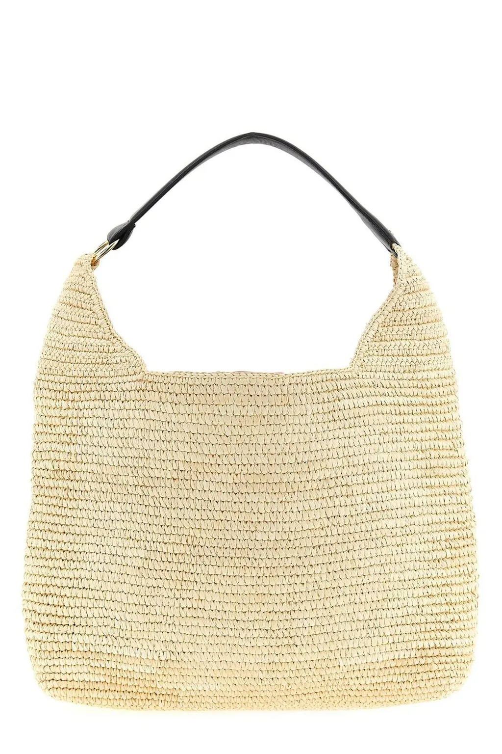 A woven straw hobo bag with a single black leather shoulder strap. The bag has a slouchy silhouette and an open top. The strap is attached to the bag with gold-tone hardware.