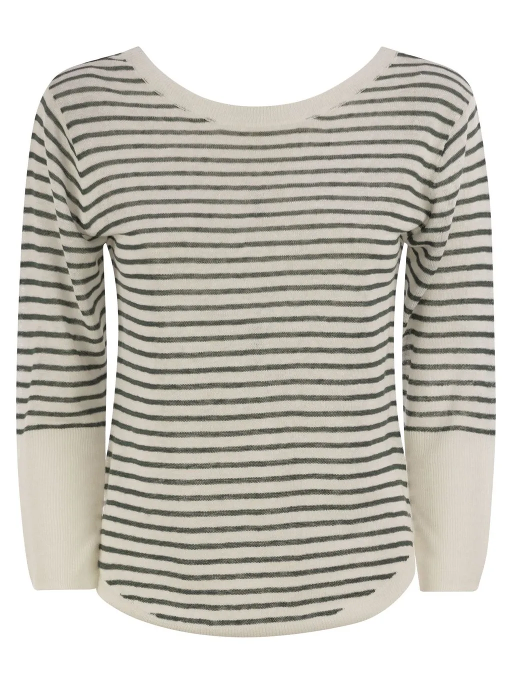 A long-sleeved top with a relaxed fit and a curved hem. It features a classic horizontal stripe pattern in white and grey. The cuffs are a solid cream color.