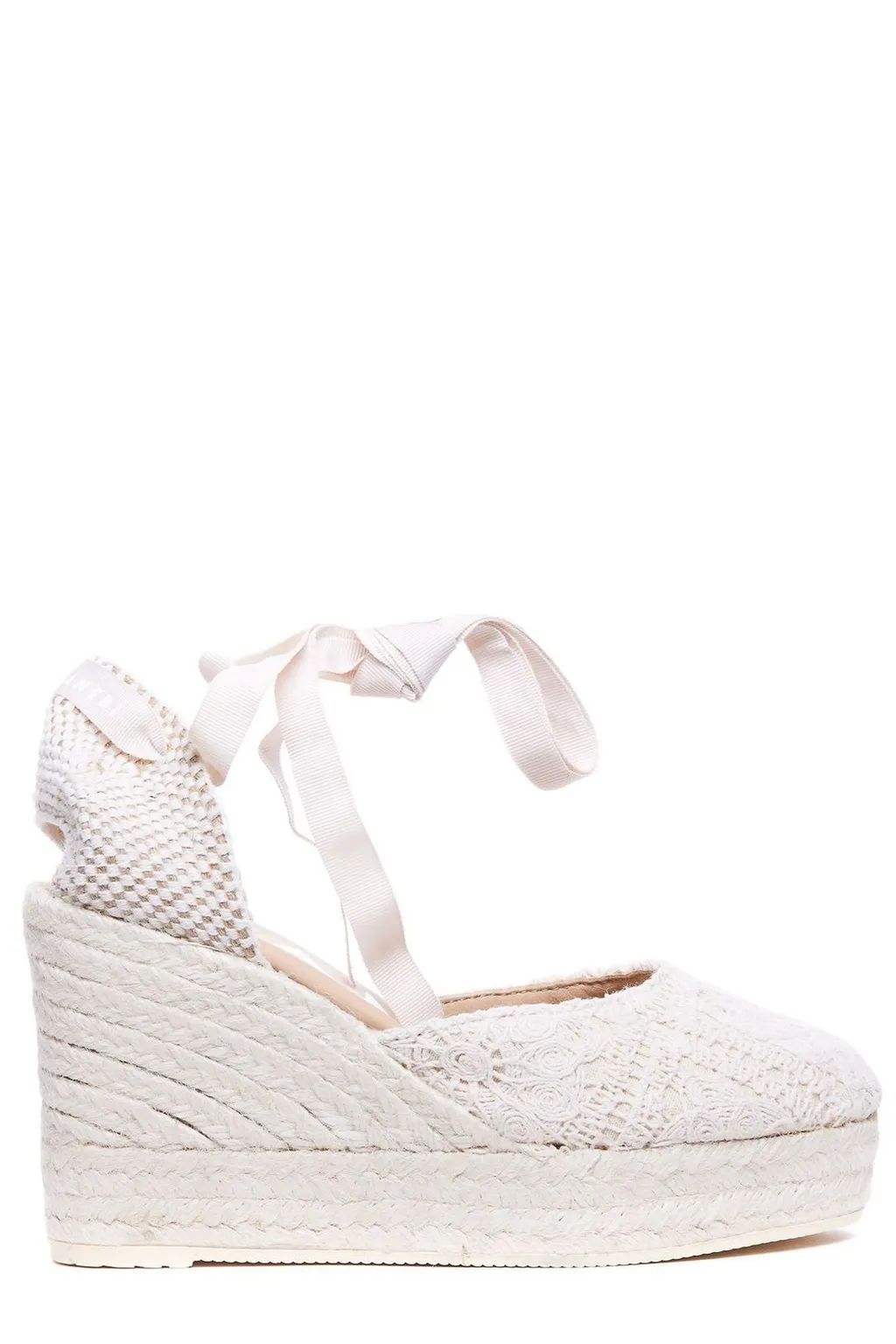 Espadrille wedge sandals with a platform sole. Features a woven jute wedge and platform, a lace-like textured upper, and ankle ties. The heel is covered in a textured knit fabric.