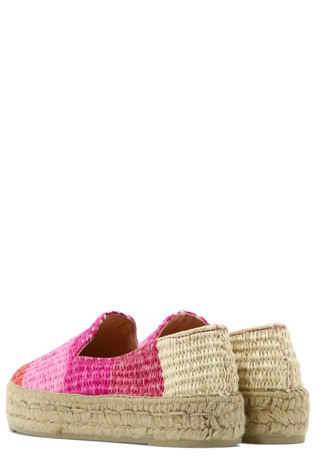Platform espadrille flats with a slip-on design. The upper features a patchwork of woven materials in shades of pink, beige, and red. The sole is a thick, braided espadrille.
