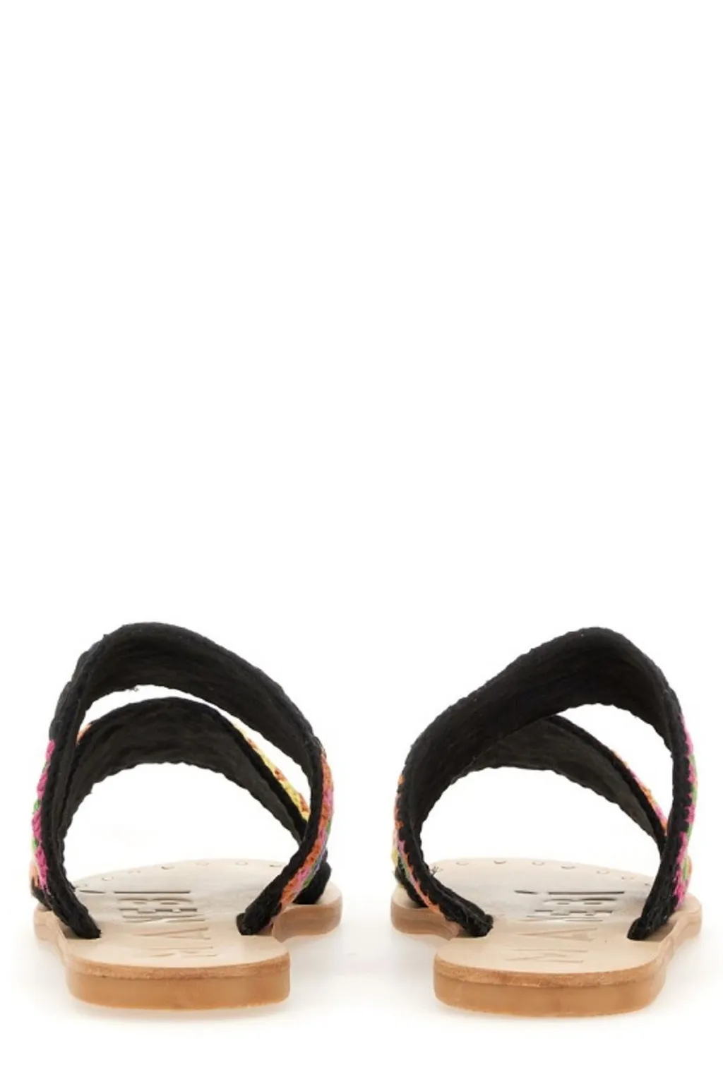 Flat slide sandals with two wide straps across the vamp. Each strap is adorned with a black crochet overlay featuring a colorful floral granny square motif. The sole appears to be a natural tan leather.