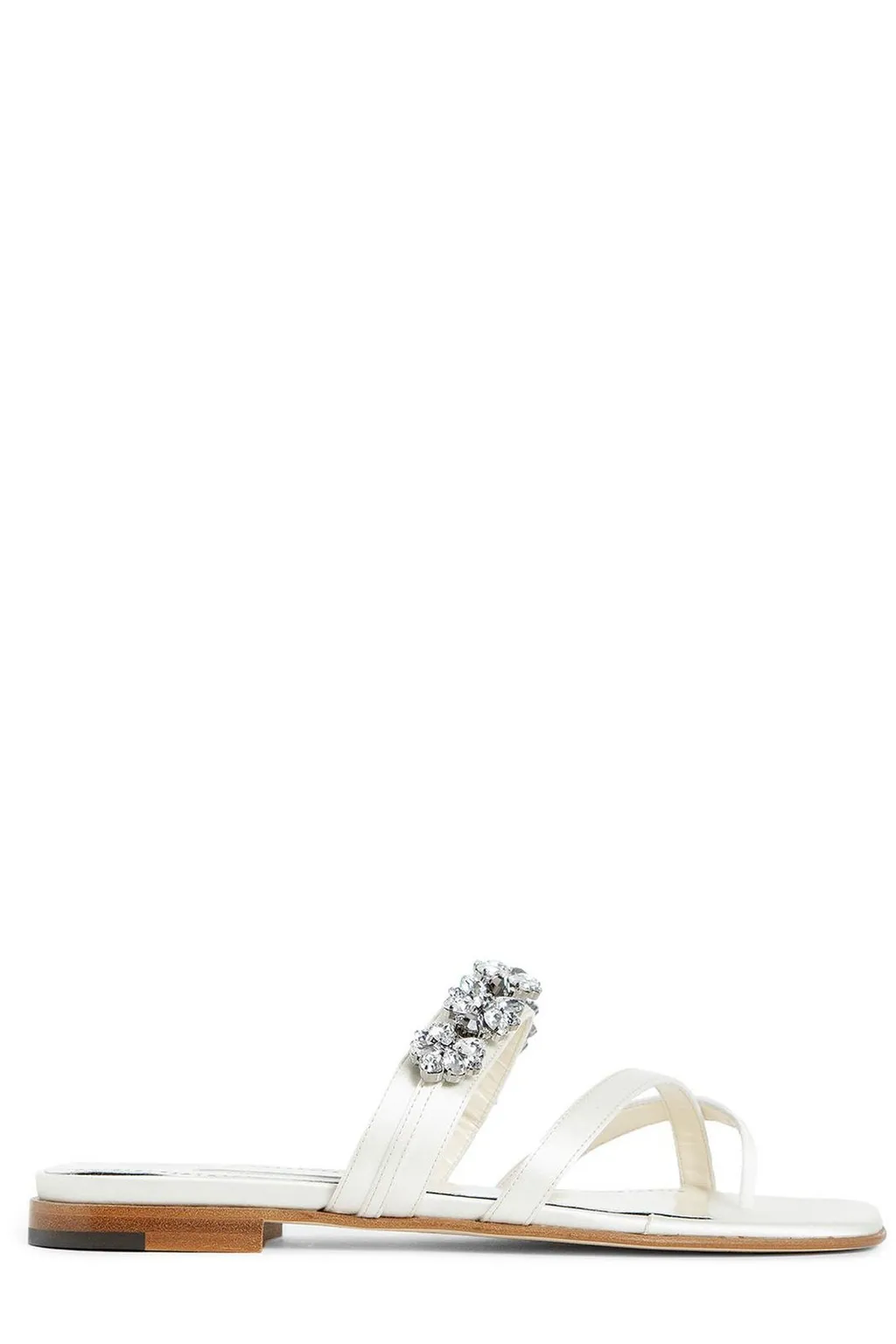DescriptionThese flat sandals feature a minimalist design with two thin straps across the vamp, one of which is adorned with a cluster of sparkling crystals. The toe post provides a secure fit, and the square toe shape adds a modern touch. The low heel offers subtle elevation.