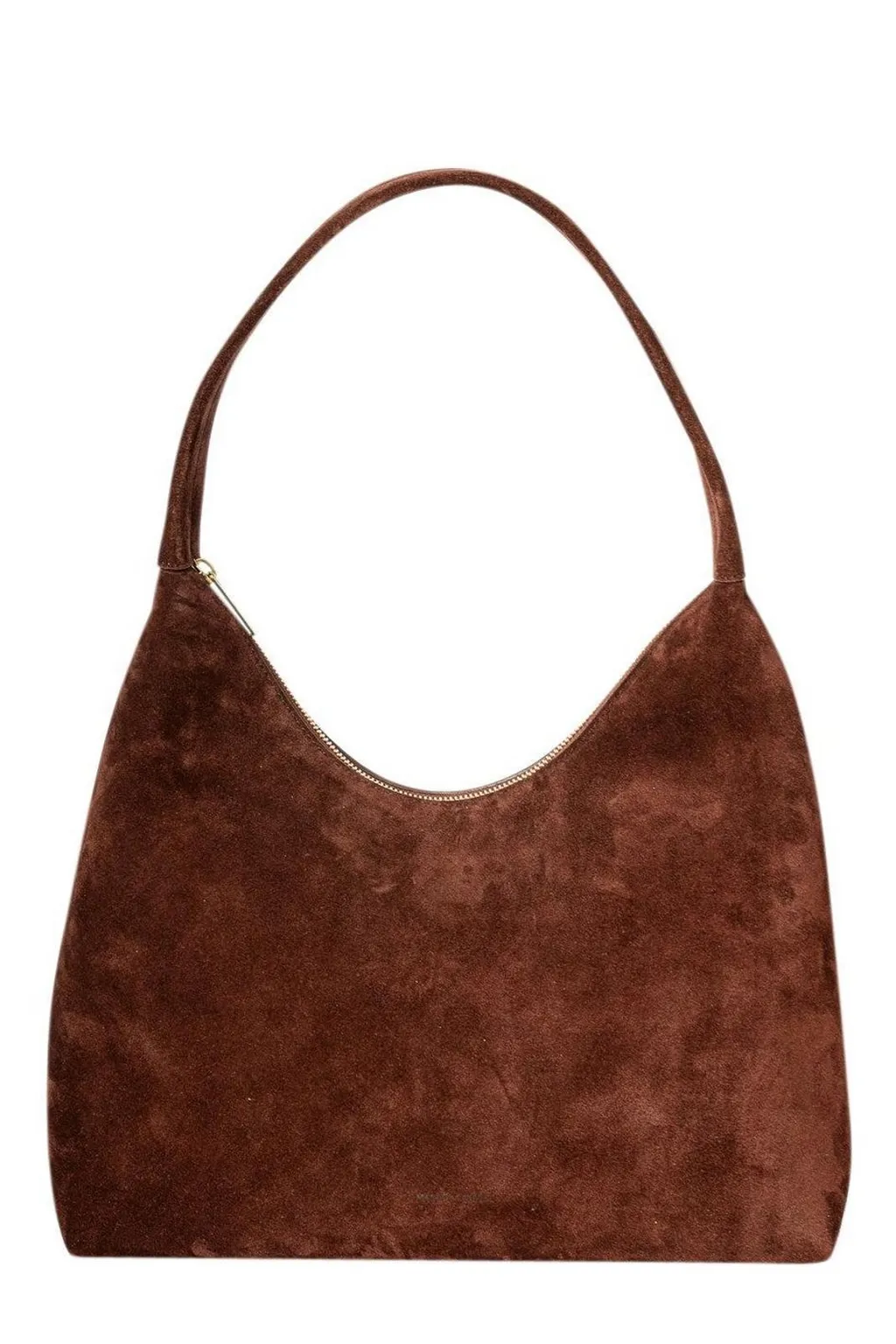 A brown suede shoulder bag with a curved zipper closure and a single shoulder strap.
