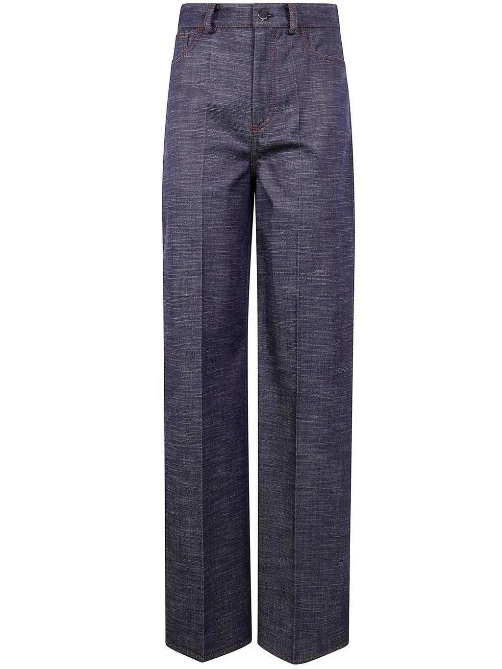 High-waisted, wide-leg trousers in a dark blue denim-like fabric. Features a button and zip closure, belt loops, and contrast stitching.