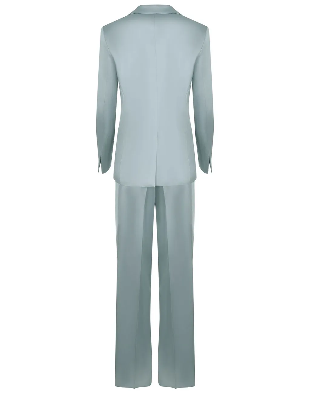 DescriptionA two-piece set featuring a single-breasted blazer with a notched lapel and a single button closure. The blazer has a slightly asymmetrical hemline and contrasting trim on the pockets. It is paired with matching wide-leg trousers that have a relaxed fit and a flowing silhouette. The fabric has a satin finish, giving it a subtle sheen.