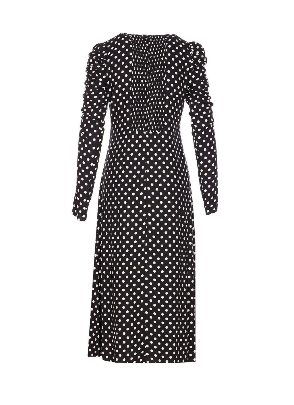 A midi-length dress with a black and white polka dot print. It features long, ruched sleeves and a ruched, draped detail on the front skirt. The dress has a round neckline and a straight hem.