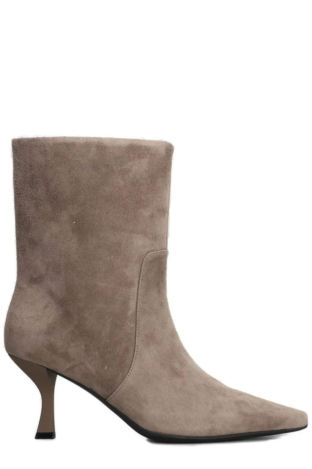 Pointed-toe ankle boots with a block heel and a side zipper closure. The boots are made of suede material.