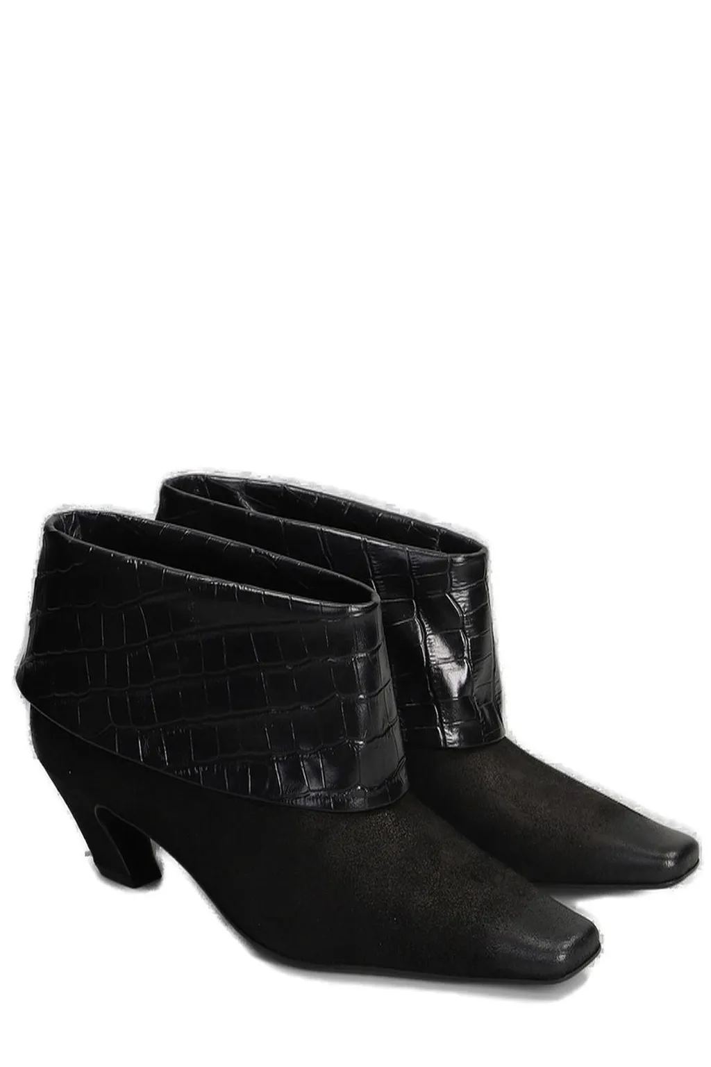 Black ankle boots with a pointed toe and a folded-over cuff featuring a crocodile-embossed texture. The boots have a low, angular heel.