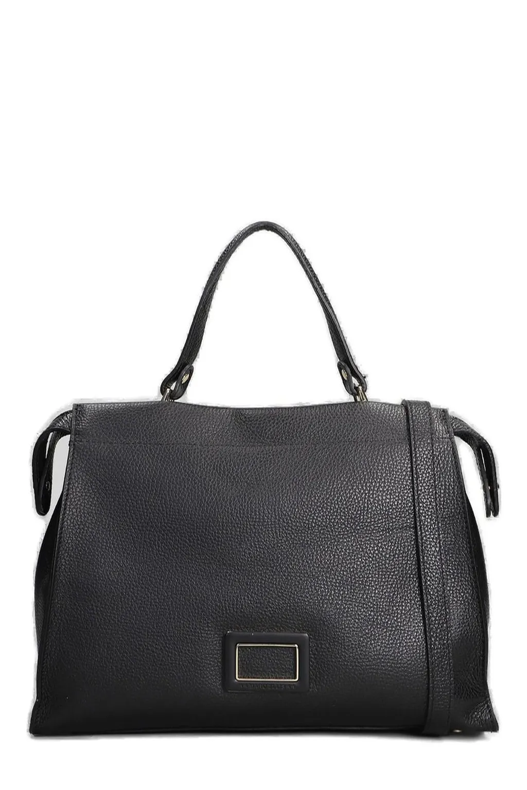 A black leather handbag with a top handle and a detachable shoulder strap. It features a rectangular metal plate on the front.