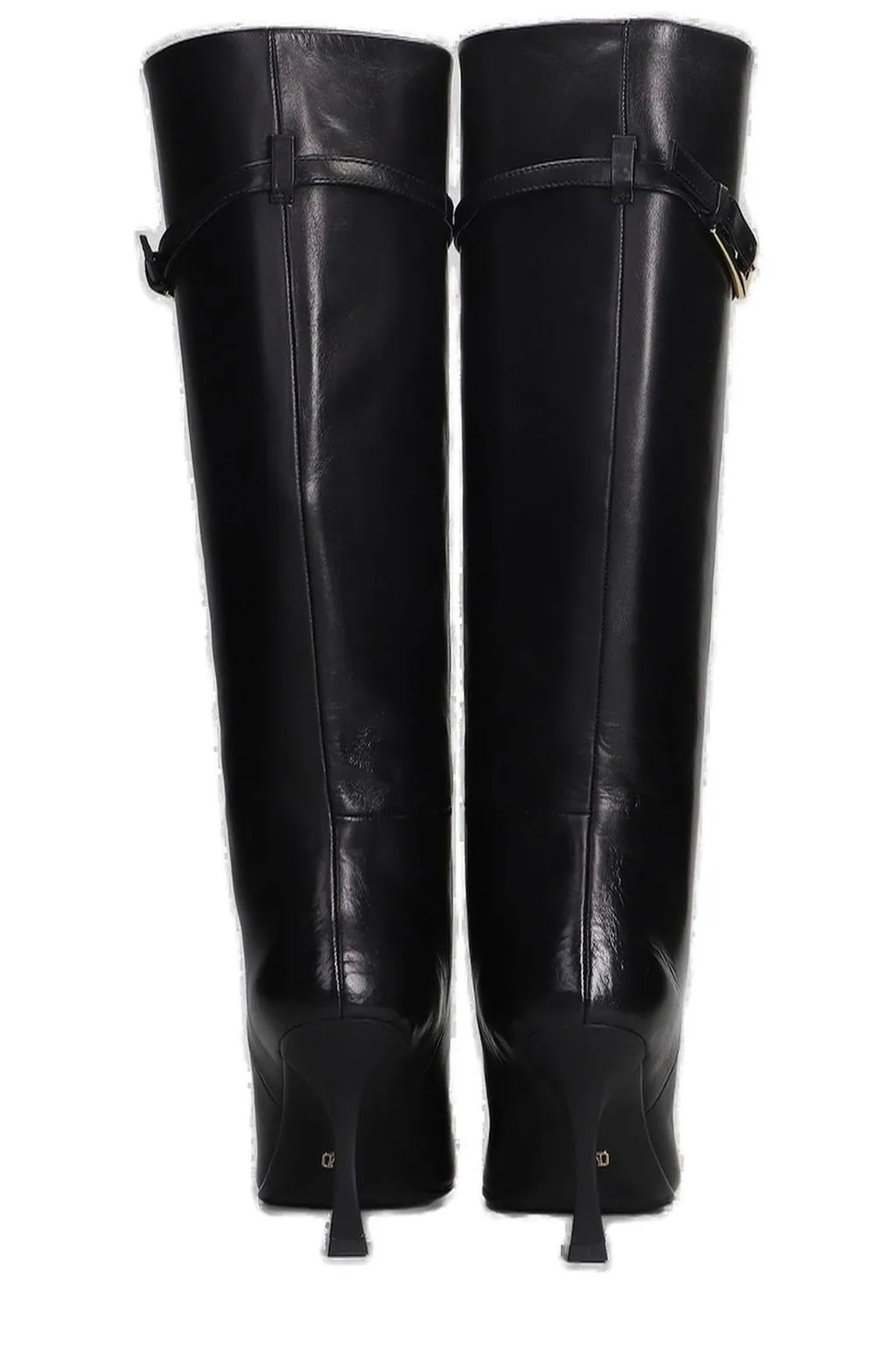 Black leather knee-high boots with a pointed toe, stiletto heel, and a decorative buckle strap at the top of the shaft. The boots have a sleek, fitted silhouette.