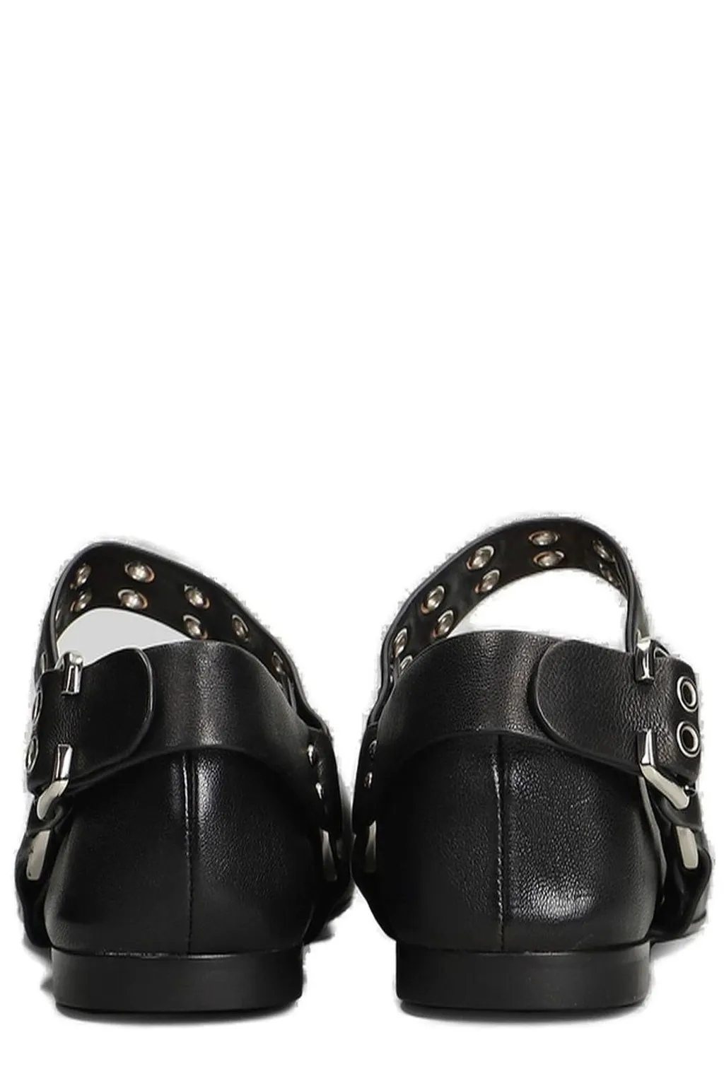 Black leather mary jane flats with a square toe. Features a decorative strap across the vamp with silver-tone eyelets and studs. The strap fastens at the ankle with a buckle closure and a silver-tone d-ring detail.
