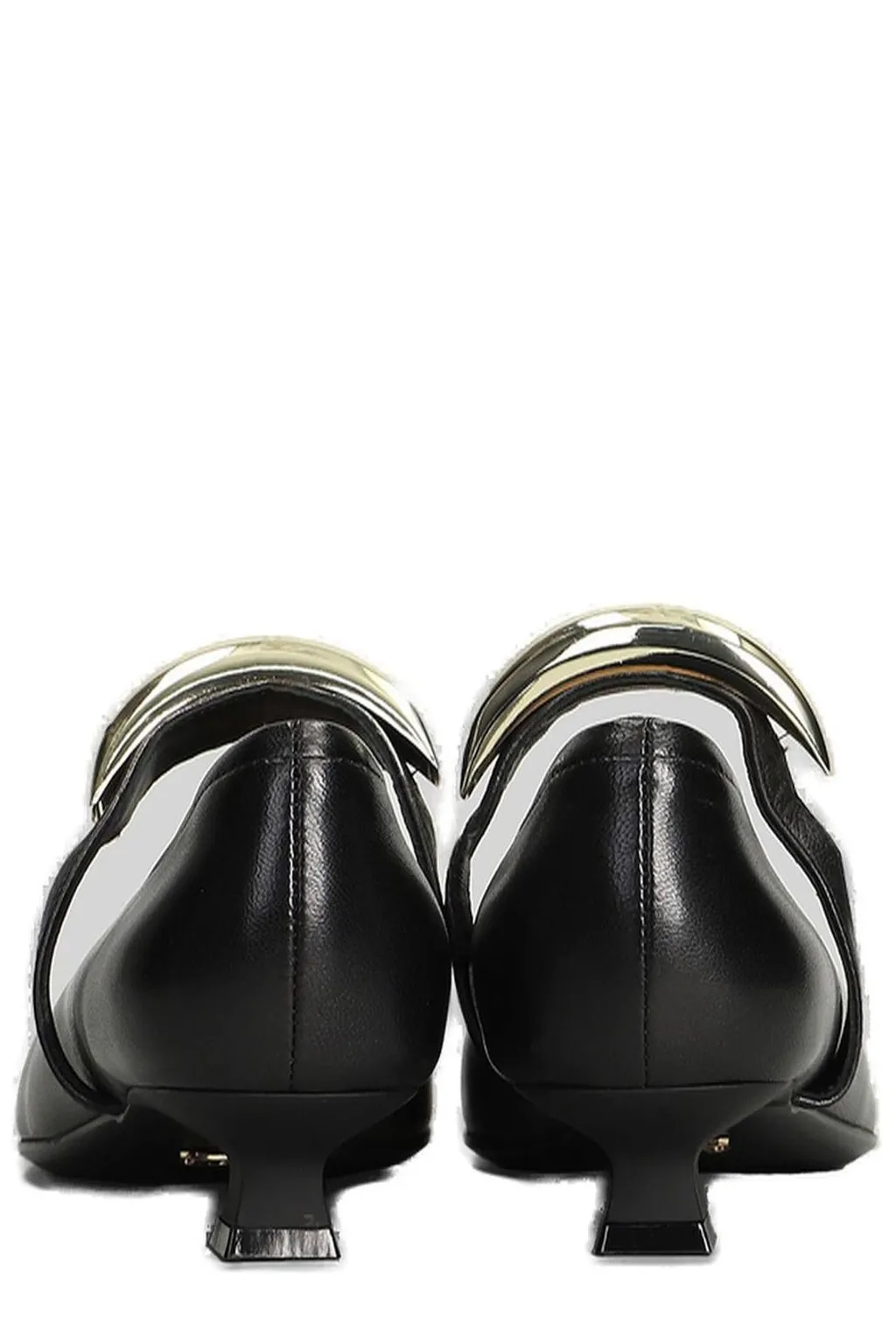Black leather mary jane pumps with a pointed toe, a low block heel, and a decorative strap with a silver-tone buckle across the vamp.