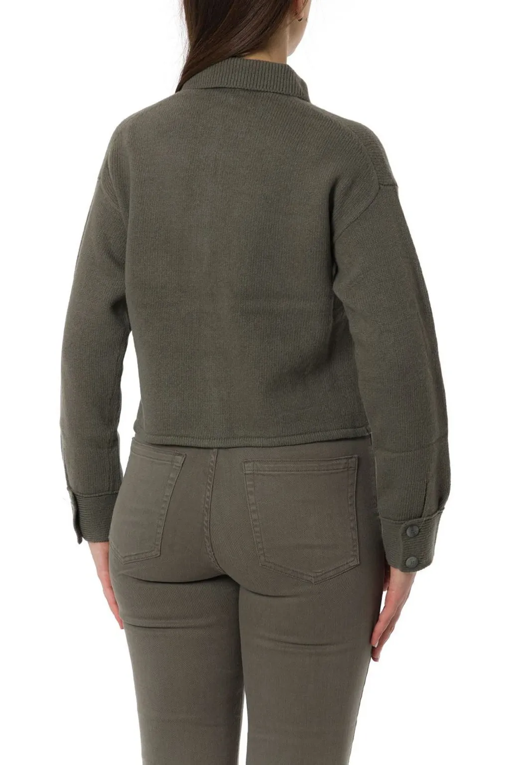 A women's olive green cardigan jacket with a collared neckline, button-down front, and two chest pockets. It features long sleeves with button cuffs and a cropped hem. The material appears to be a knit fabric.