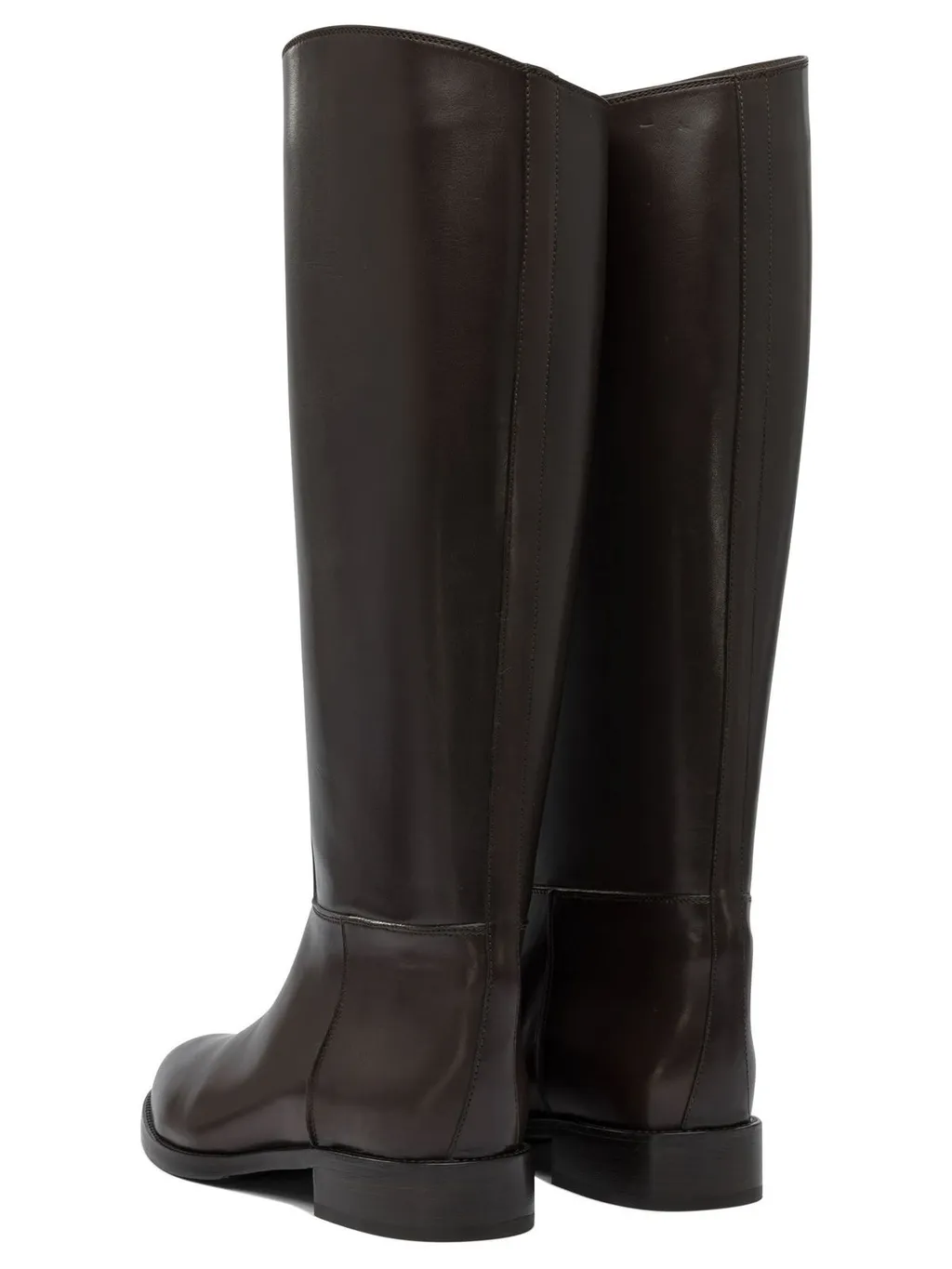Knee-high riding boots with a smooth, polished finish. They feature a rounded toe and a low, block heel. The shaft is straight and tall, designed for a sleek, equestrian-inspired look.