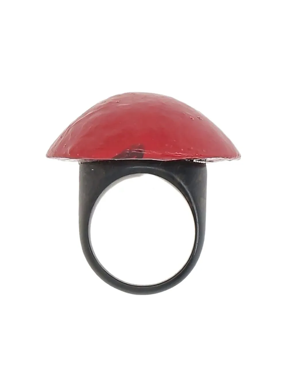 A statement ring featuring a dome-shaped, red enameled top resembling a mushroom cap, set on a dark, band-style ring base.
