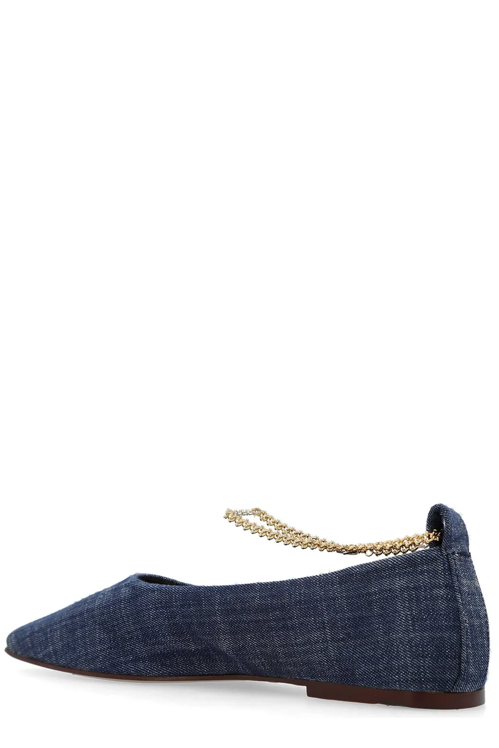 Pointed-toe ballet flats crafted from blue denim fabric. They feature a delicate gold-tone chain detail that wraps around the ankle, adding a touch of elegance. The flat sole ensures comfort for everyday wear.