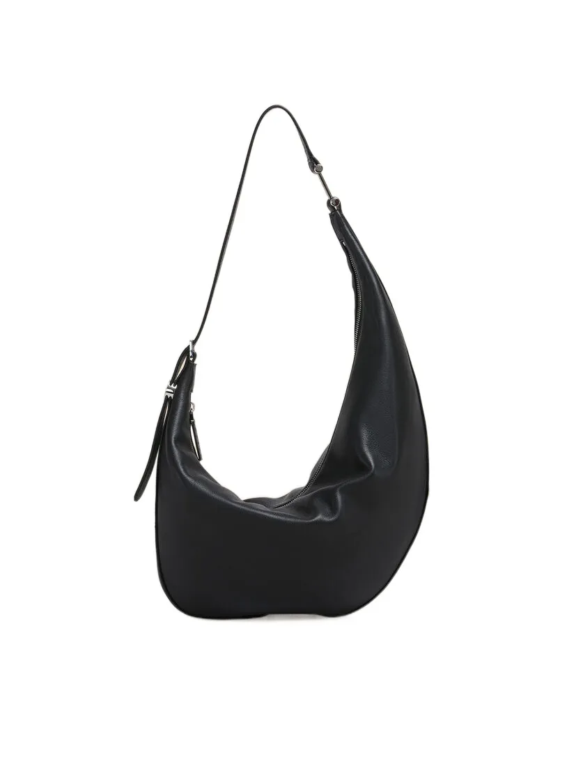 DescriptionA small, loose, asymmetrical hobo bag that highlights natural texture. It features adjustable snap shoulder straps, a round logo disc, and metal details for a suspension effect. The bag has a zippered opening and includes built-in zipper pockets.