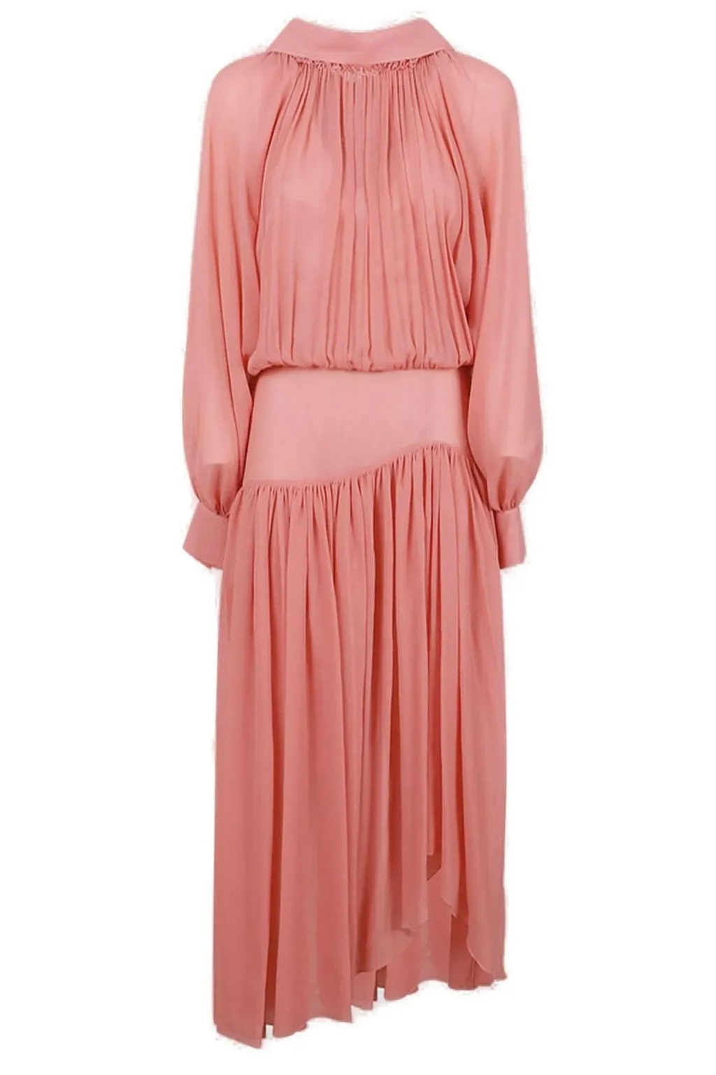 DescriptionA long-sleeved maxi dress with a collared neckline and a tie closure. The bodice features intricate pleating, creating a gathered effect. A defined waistband cinches the silhouette, leading to a flowing skirt with an asymmetrical hemline. The sleeves are full and gathered at the cuffs.