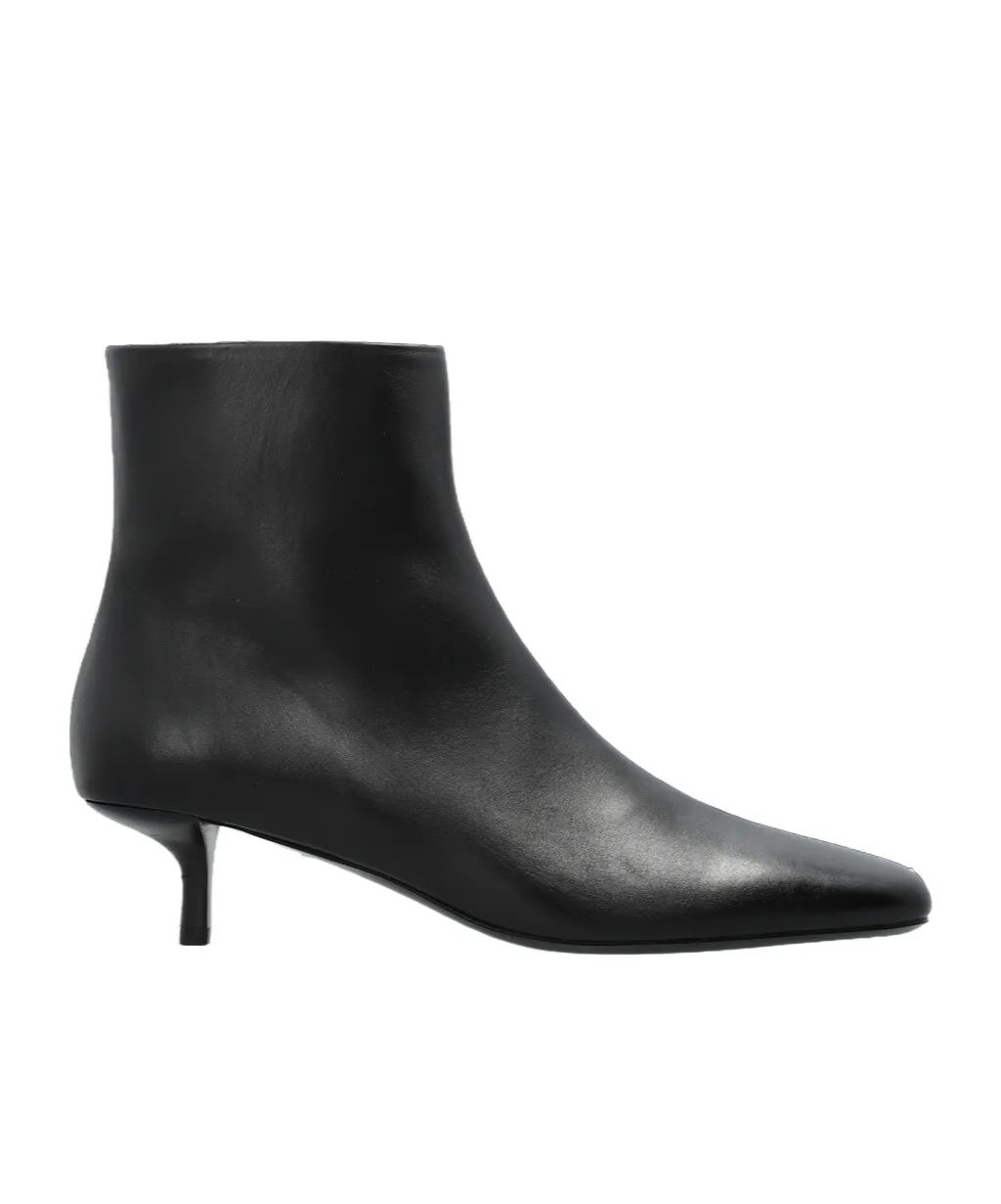 Leather ankle boots with a short tube and kitten heel. Features a square toe.