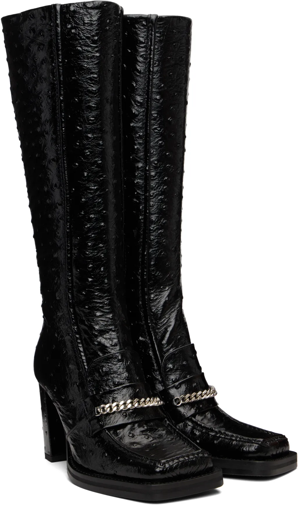 DescriptionCalfskin boots with a dot embossment. Features a square moccasin toe, chain and strap detail, elasticated back collar, and inner zipper. Set on a rubber-injection-molded square heel and textured rubber sole.