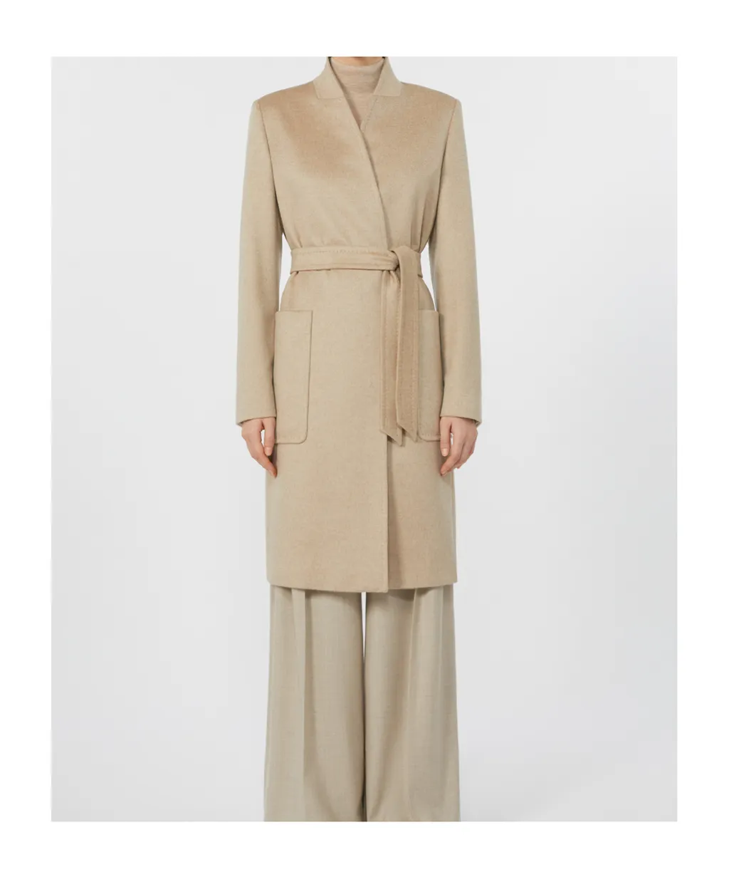 DescriptionCashmere and viscose blend robe coat with a relaxed fit. Features a chinese collar, raglan sleeves with side buttons, a matching waist belt, and large patch pockets on the front. Includes a central back slit.