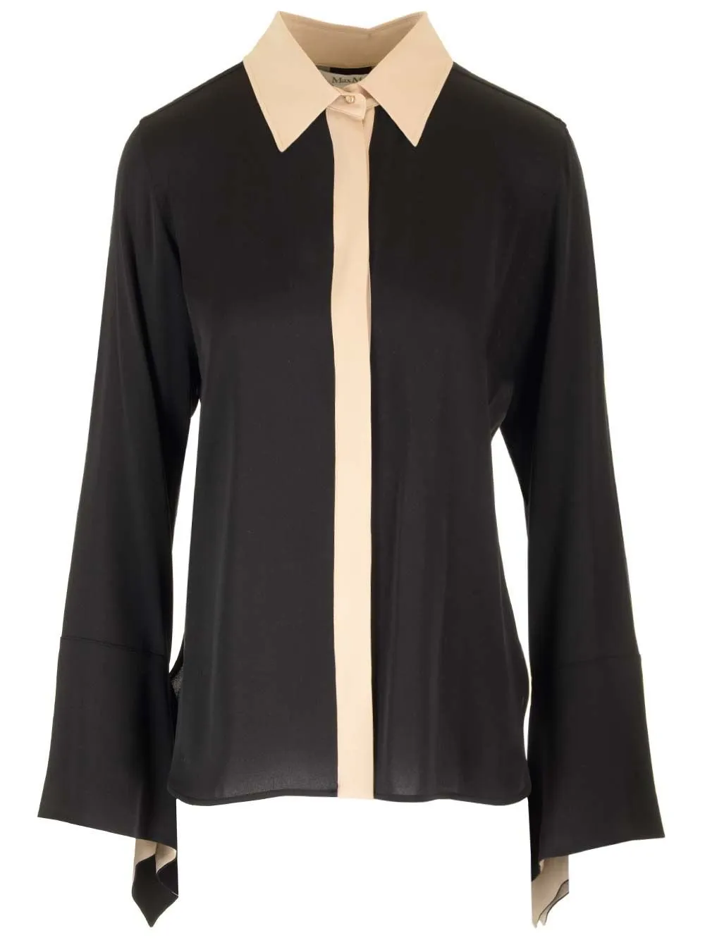 A silk shirt in black and beige. This piece features a relaxed fit and a curved hem. Details include a contrasting collar and cuffs.
