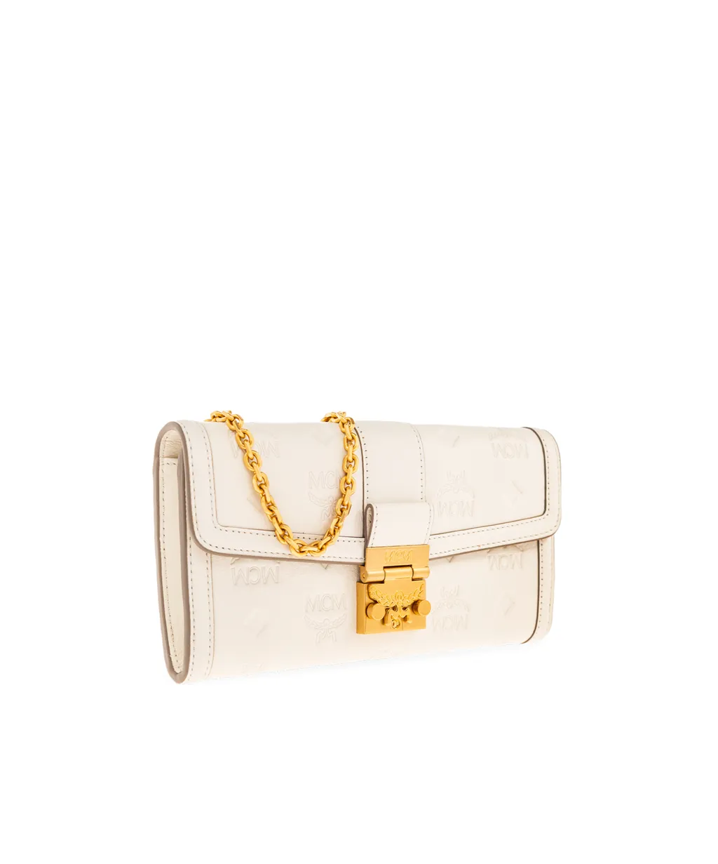 Wallet with embossed letter pattern, removable shoulder chain, and adjustable shoulder straps.