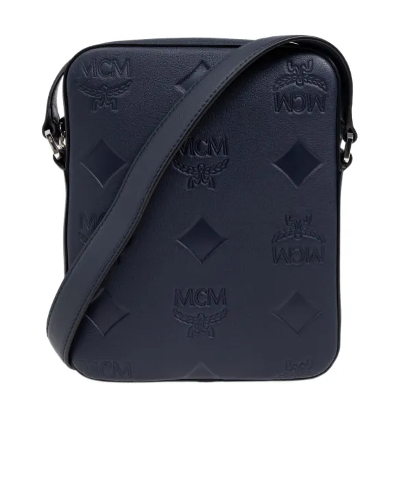 Leather crossbody bag in navy blue with all-over mcm logo embossing. Features an adjustable shoulder strap and zipper closure.
