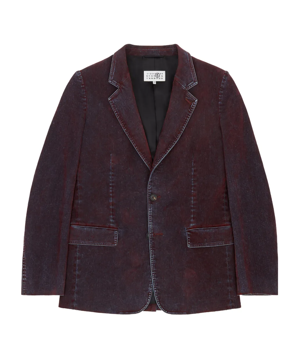 DescriptionCotton and spandex blend denim blazer with a slim fit. Features a notched lapel, two-button closure, and flap pockets. Detailed with contrasting color stitching.