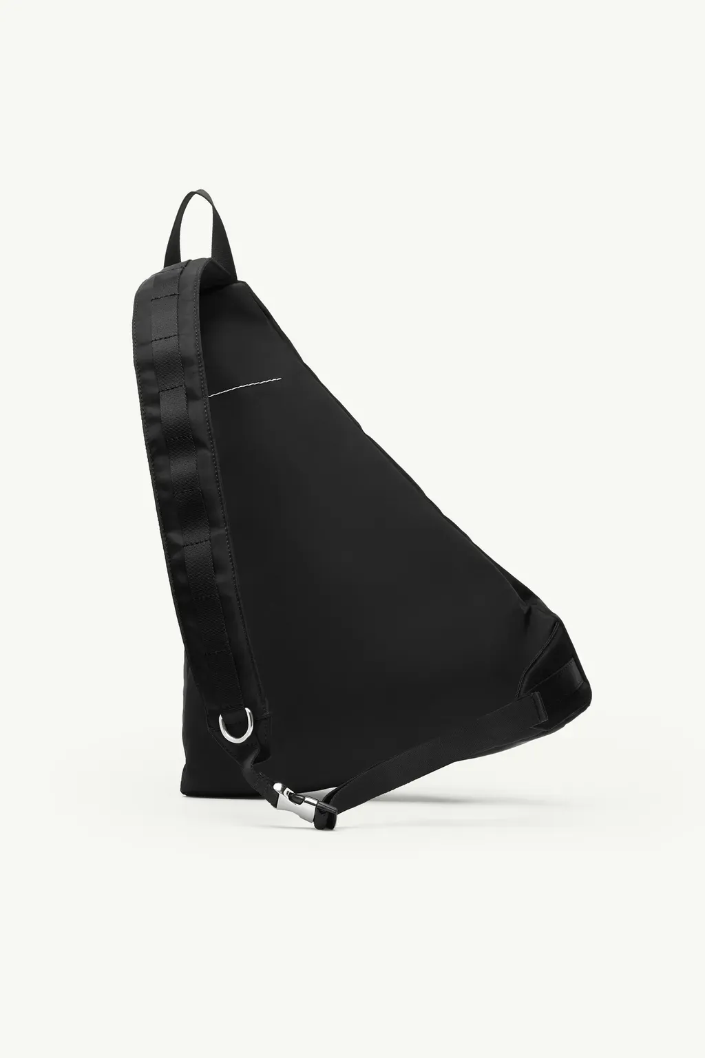 DescriptionA polyamide-nylon sling backpack with an asymmetric construction. Features a diagonal strap with a d-ring and metal clip, a zipped front pocket, and a tonal numeric logo. Finished with the maison’s white stitch line at the back.