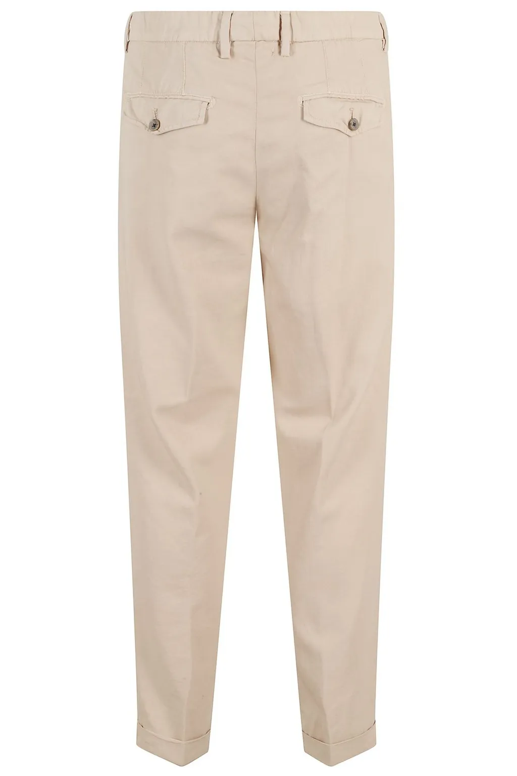 100% cotton pants with a relaxed fit. Features include pleats, a button and zip closure, and two back pockets.