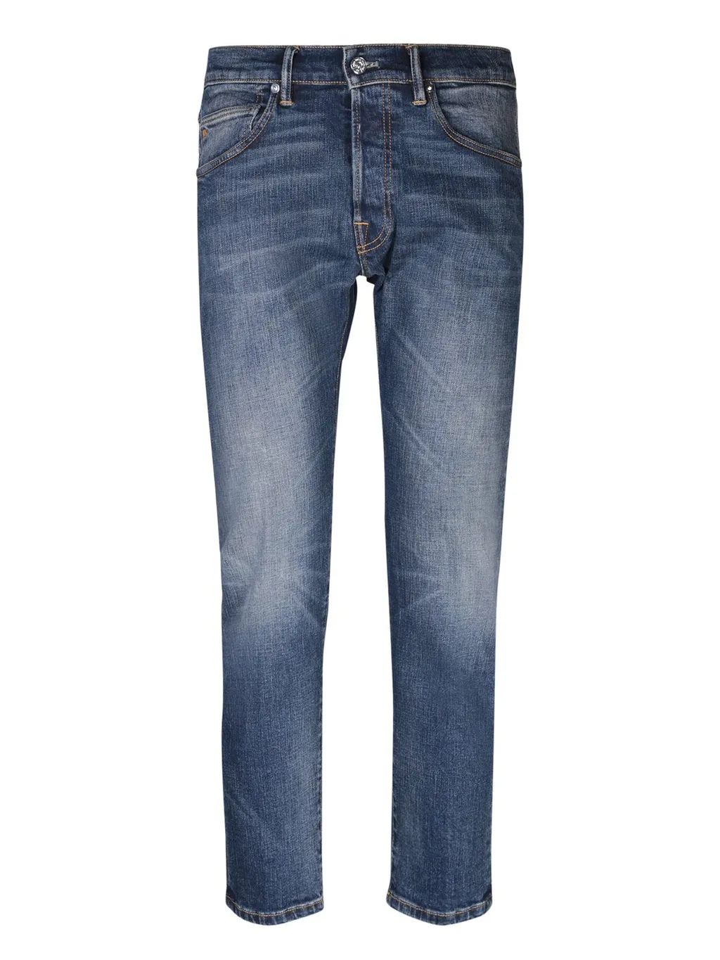 Cotton and elastane slim fit jeans. Features a button and zip closure, five pockets, and a branded patch at the back.