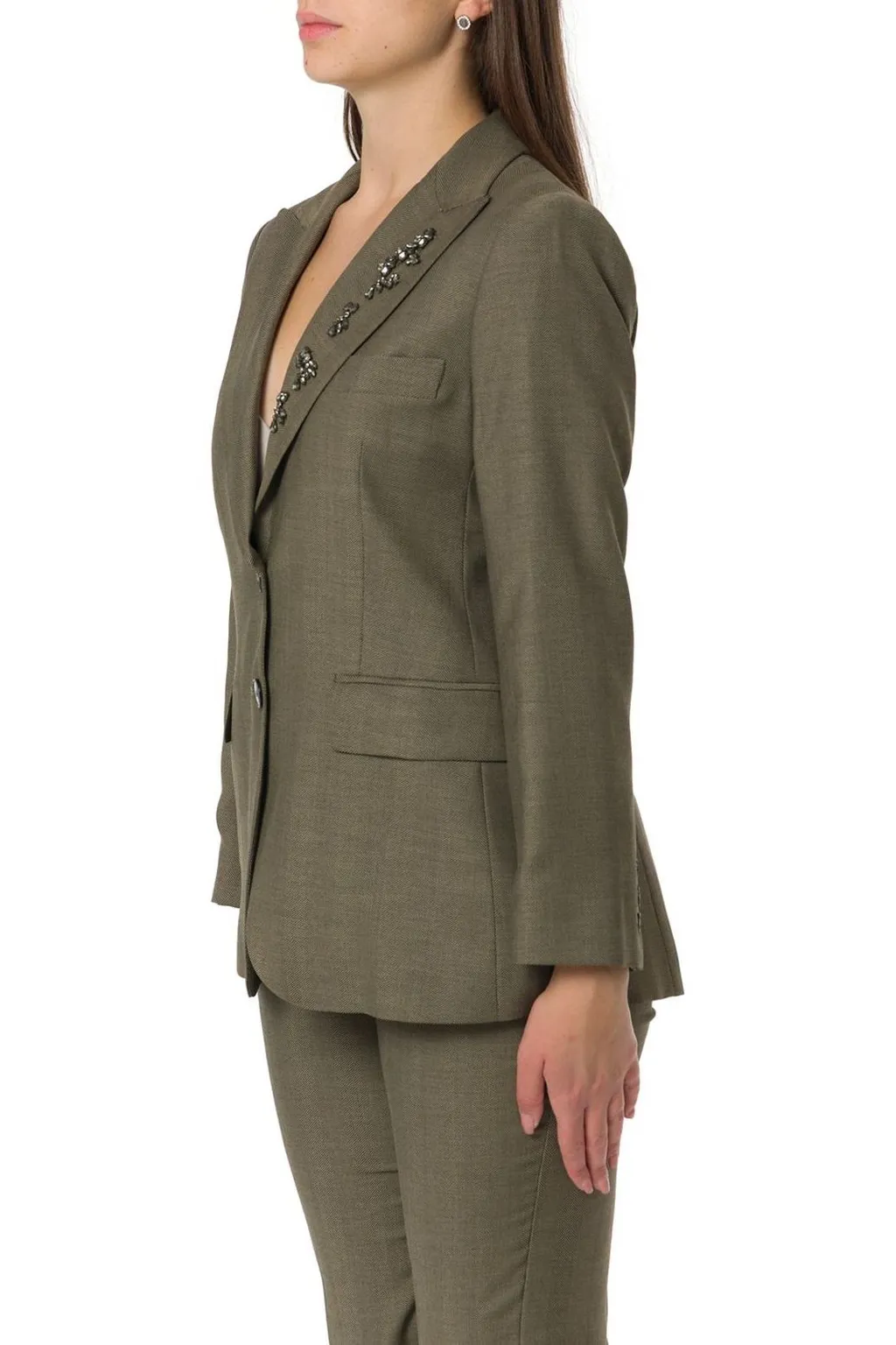 A single-breasted blazer with a notched lapel, featuring a two-button closure. The blazer has two flap pockets on the front and decorative embellishments on the left lapel. The back has a single vent and button detailing on the cuffs.
