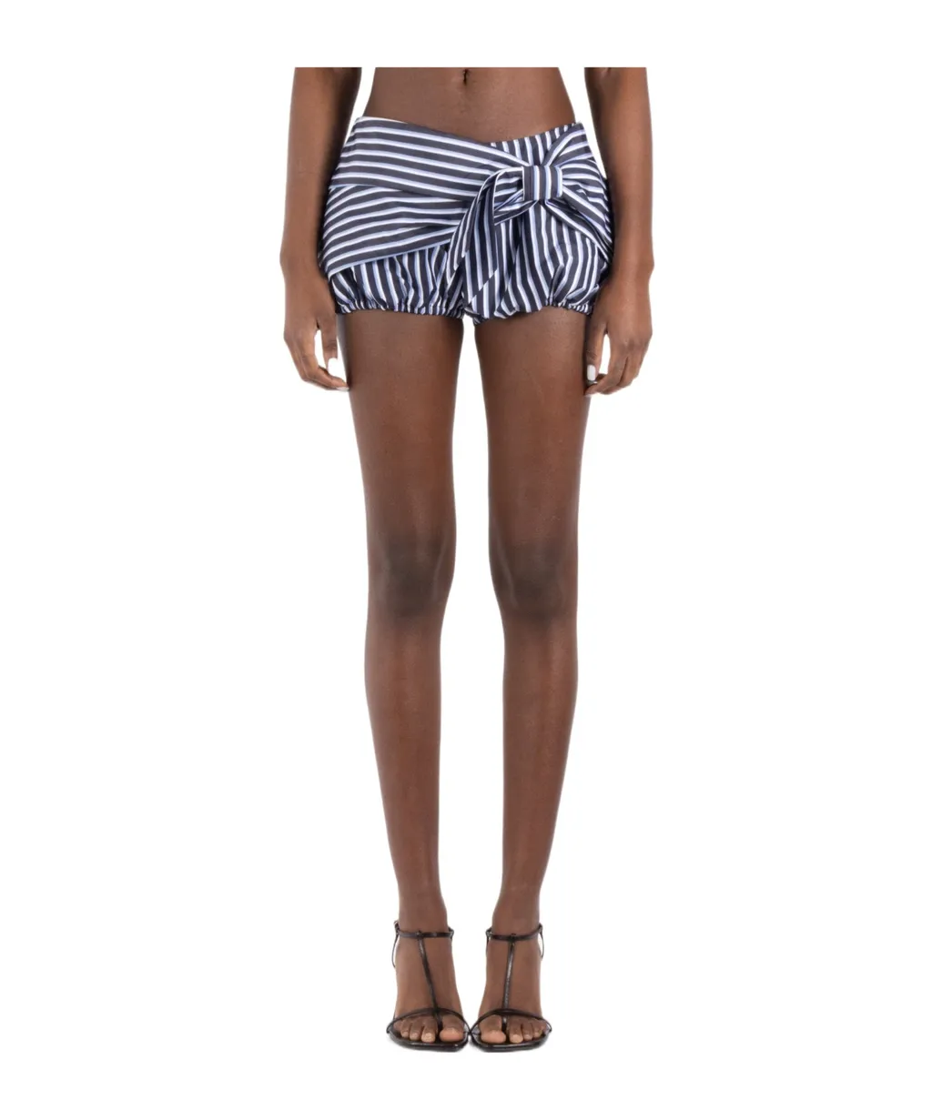 Cotton striped shorts with a side bow design. These shorts feature a gathered hem.