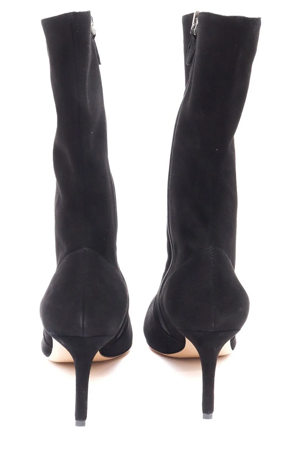 Suede ankle boots with a pointed toe and stiletto heel. Features a zip closure.