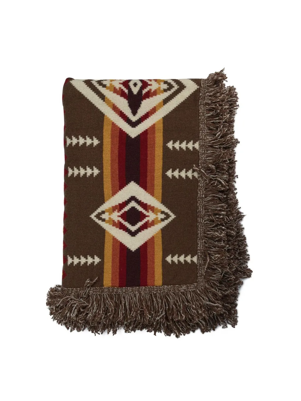 100% wool throw in a brown, multicolored apache pattern. Features a fringed hem.