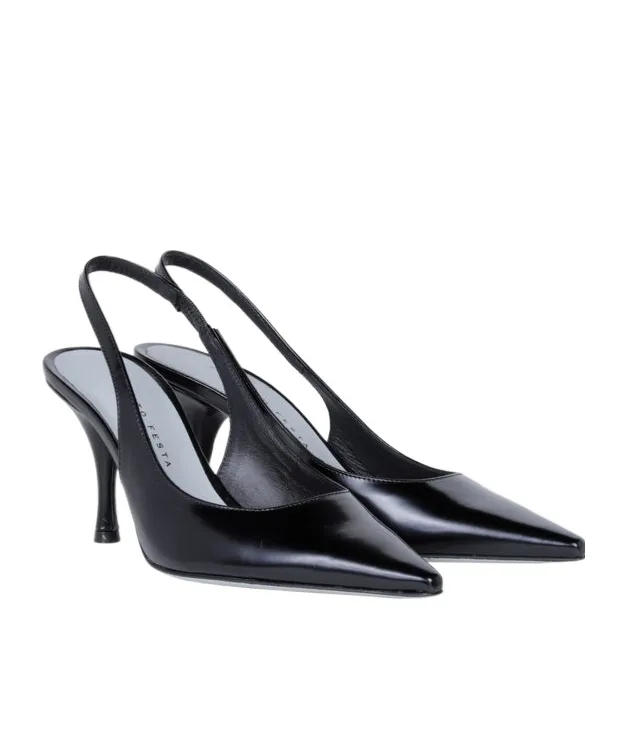 Leather pumps with a pointed toe and a thick 50mm heel. Features a slingback strap with buckle closure and a decorative bow at the vamp.
