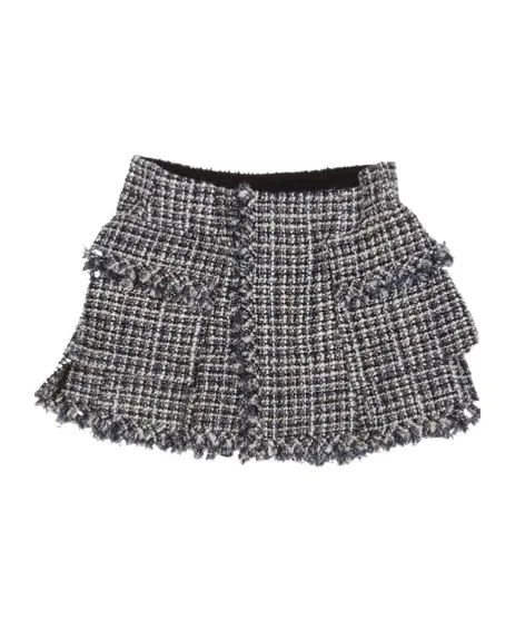 Wool blend tweed mini skirt with an asymmetric wrap silhouette. Features a layered design with frayed edges and a button closure.