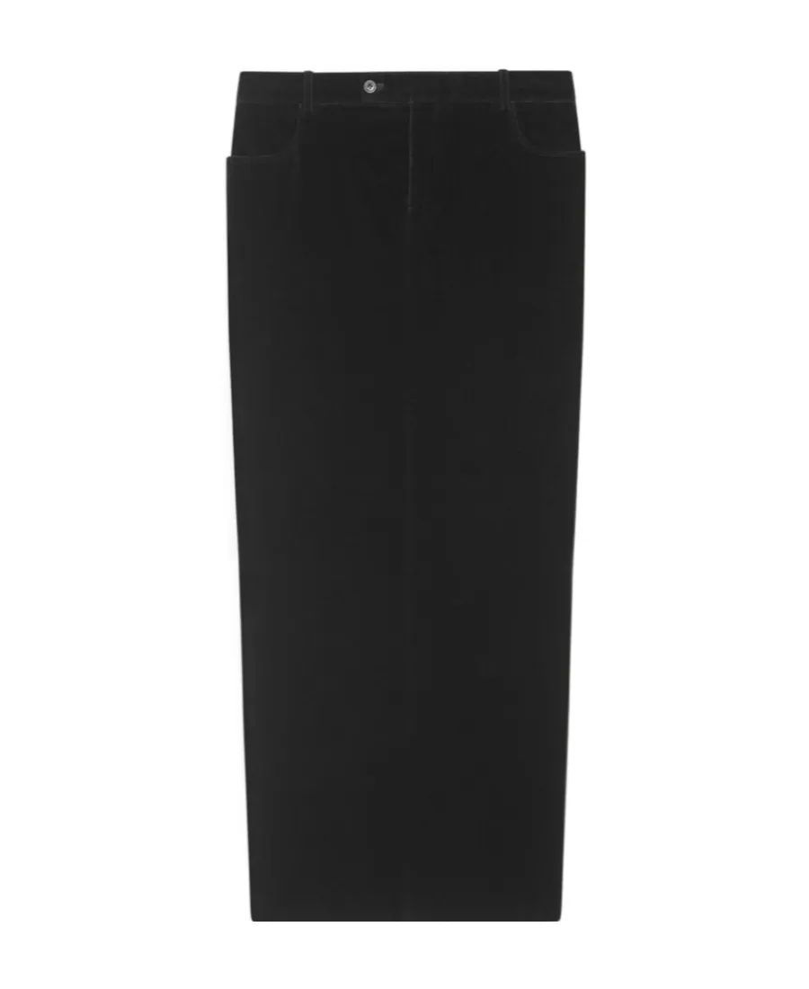 DescriptionThis long skirt is made of cotton velvet. It features a straight fit with a front button and hidden zipper closure. Details include two side pockets and two embossed edge bags with buttons on the back.