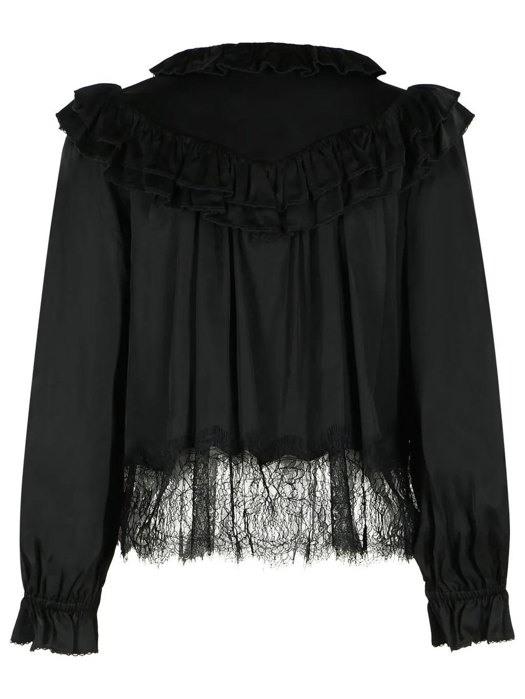 DescriptionA black blouse featuring a dramatic ruffled collar with lace inserts and a tie detail. The long sleeves have elasticated cuffs, and the hem is adorned with a delicate lace trim. The silhouette is relaxed with a slightly cropped length.