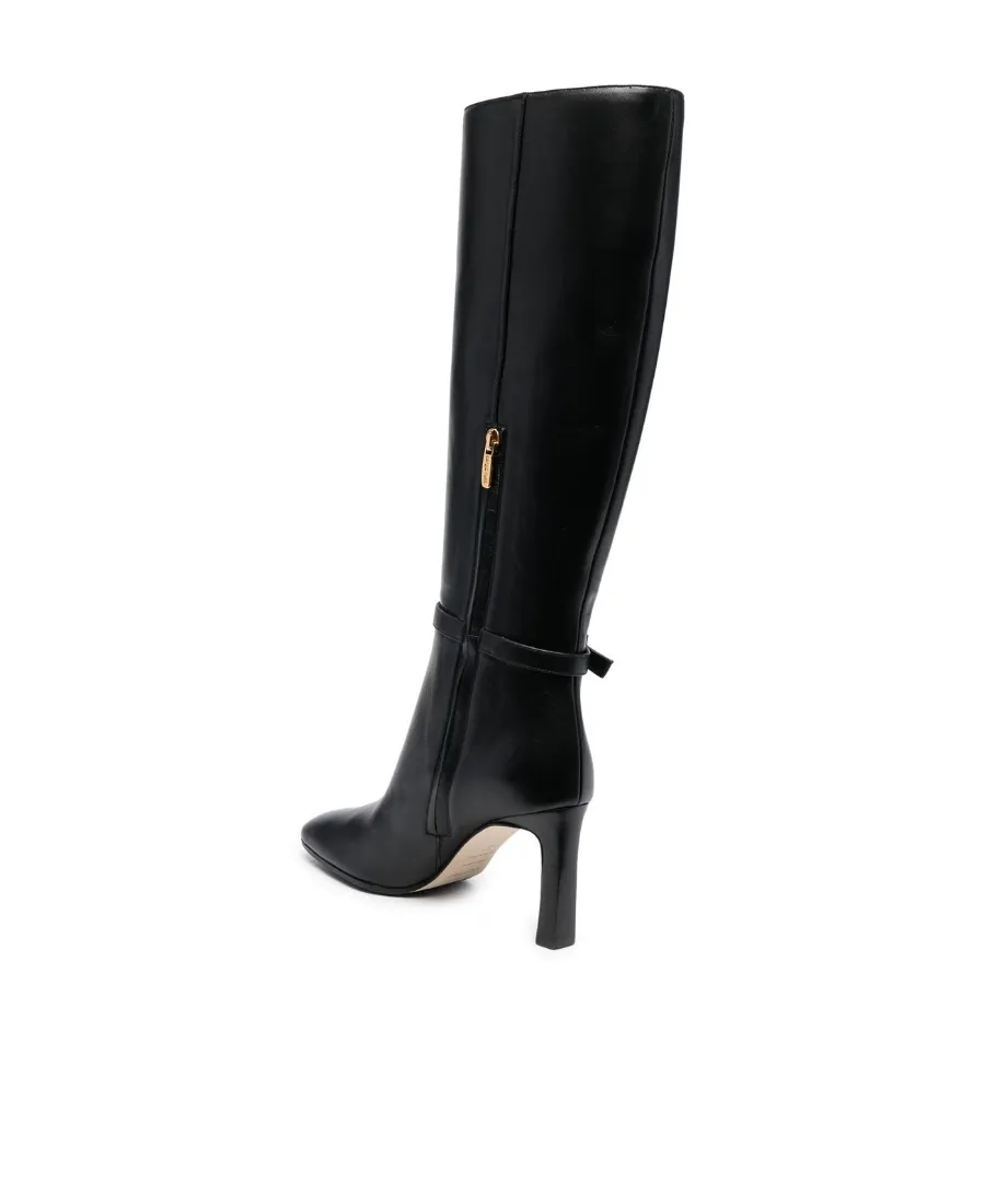 Decorative buckle, side zipper, almond toe, knee-high.
