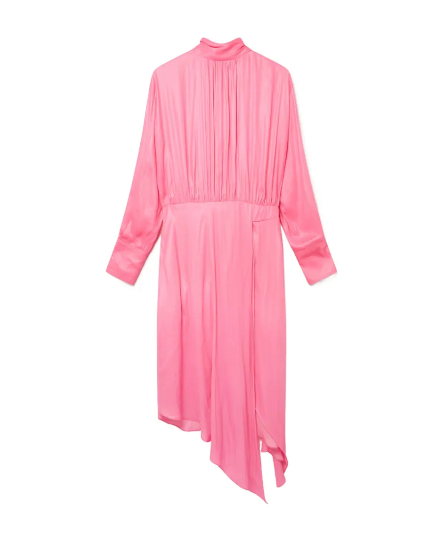 Polyester fiber blend long dress with a high collar and long sleeves. Features tie detailing at the neckline, ruched detailing at the bodice, and an asymmetric hemline.