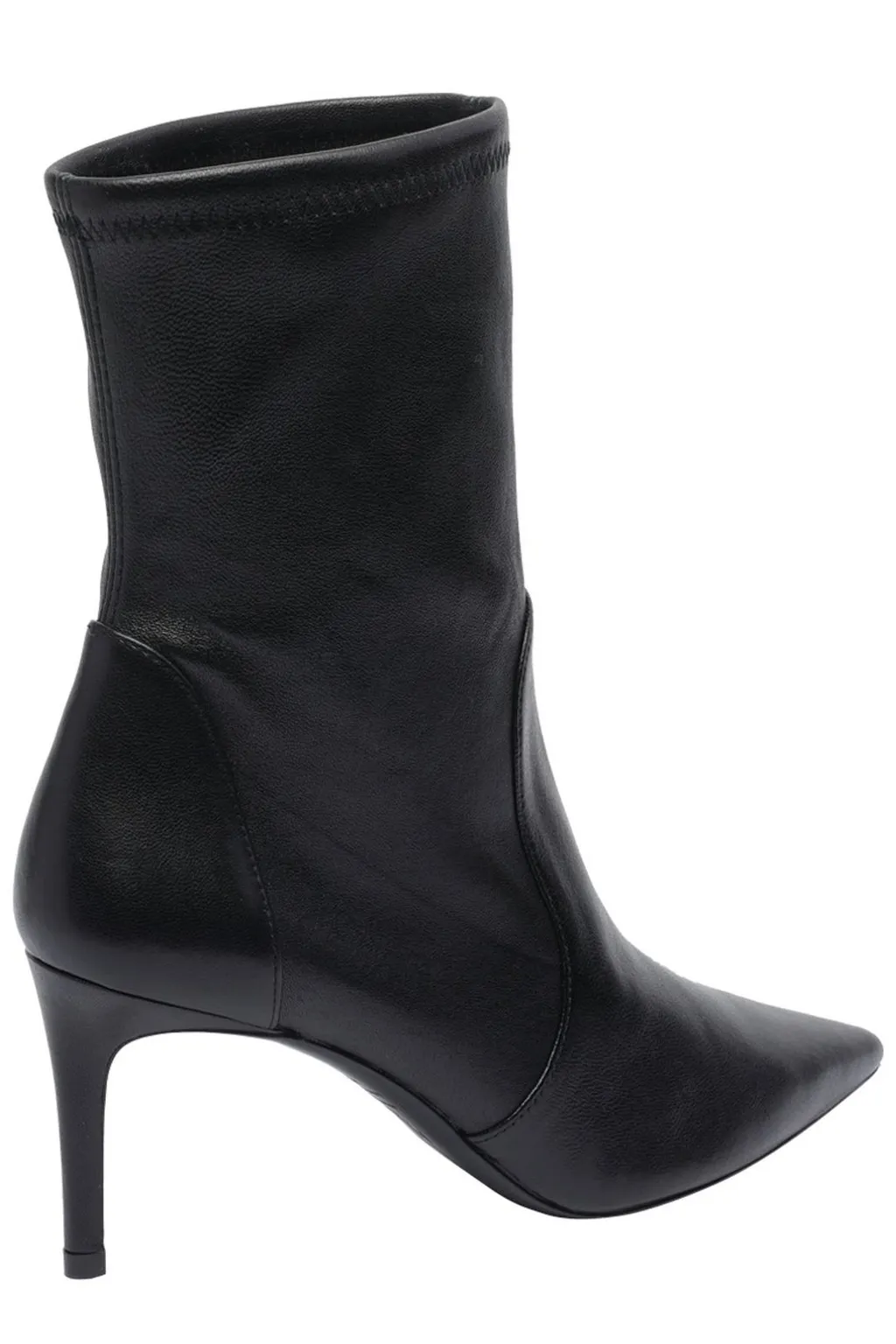 Black leather ankle boots with a pointed toe and a stiletto heel. The shaft is made of a stretch material for a snug fit.