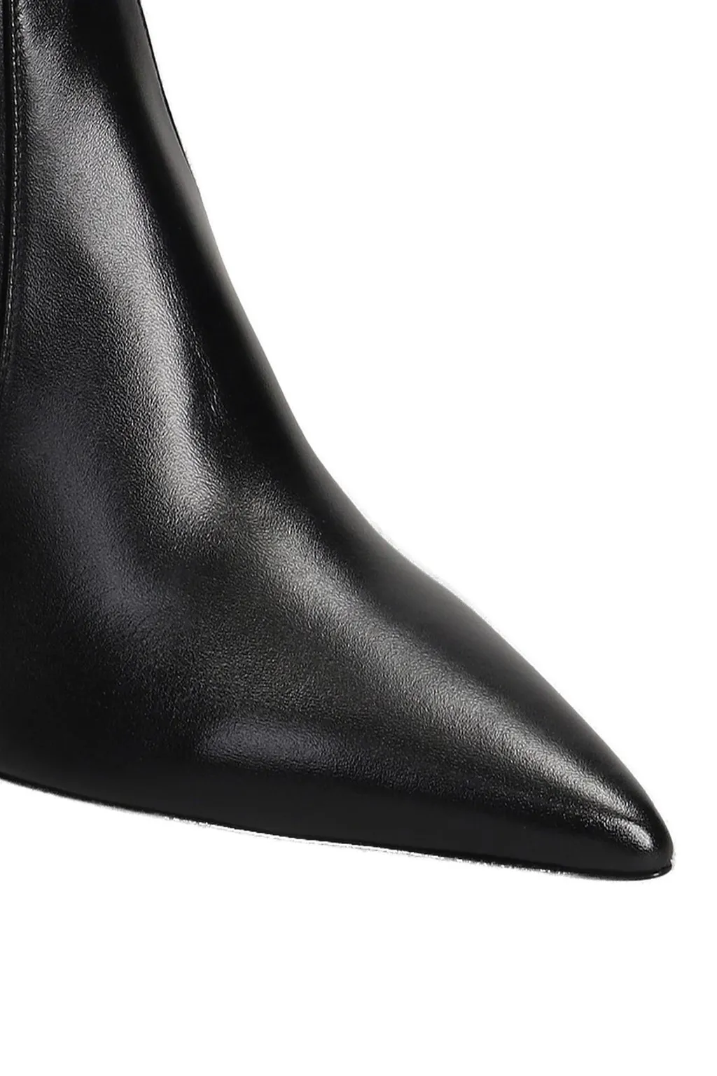 Black leather ankle boots with a pointed toe, a sculpted heel, and a side zipper closure. The boots have a smooth finish and a soft lining.